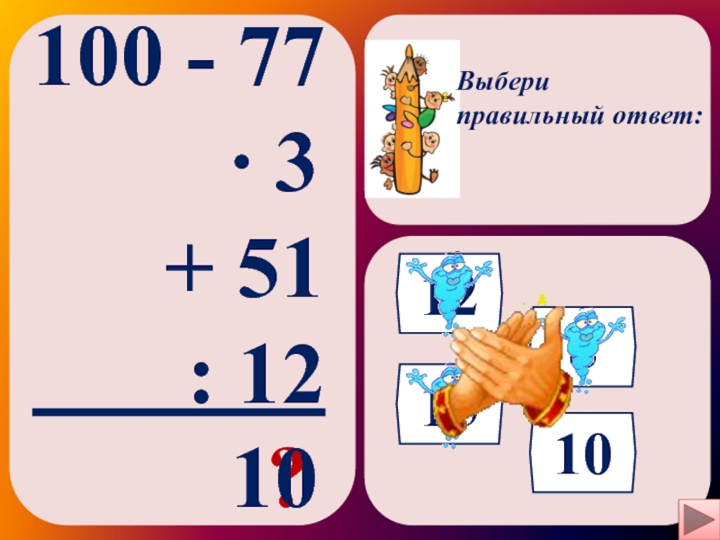 Выбери правильный ответ:100 - 77     ∙ 3   + 51