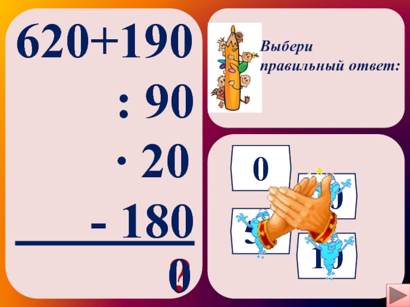 Выбери правильный ответ:620+190    : 90    ∙ 20   - 180