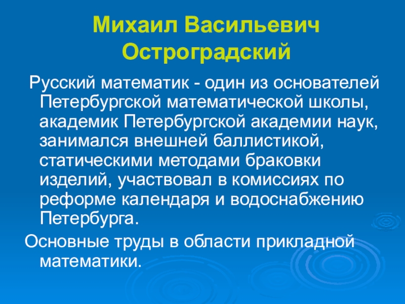 школы, академик Петербургской академии наук, занимался внешней баллистикой, статическими методами браковки изделий, участвовал в комиссиях по реформе календаря и водоснабжению Петербурга.