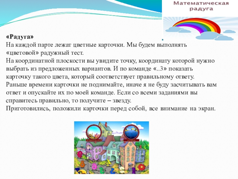 На координатной плоскости вы увидите точку, координату которой нужно выбрать из предложенных вариантов. И по команде «..3» показать карточку такого цвета, который соответствует правильному ответу. Раньше времени карточки не поднимайте, иначе я не буду засчитывать вам ответ и опускайте их по моей команде. Если со всеми заданиями вы справитесь правильно, то получите – звезду.