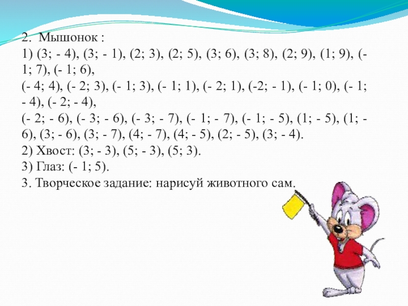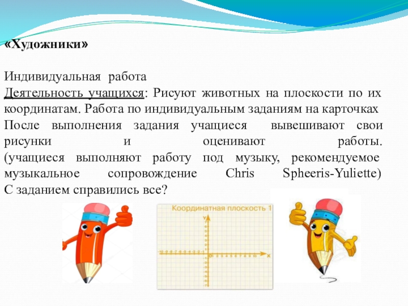 Деятельность учащихся: Рисуют животных на плоскости по их координатам.