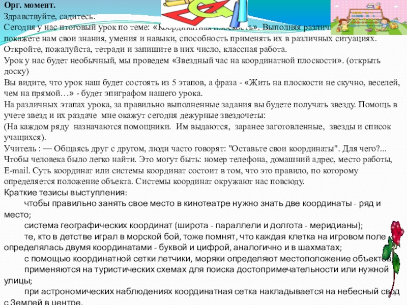 Учитель : —Ребята, скажите, с каким новым понятием вы сейчас встретились?..... Верно – координатная плоскость. И сегодня целью нашего урока станет знакомство с координатной плоскостью и умение работать в системе координат.