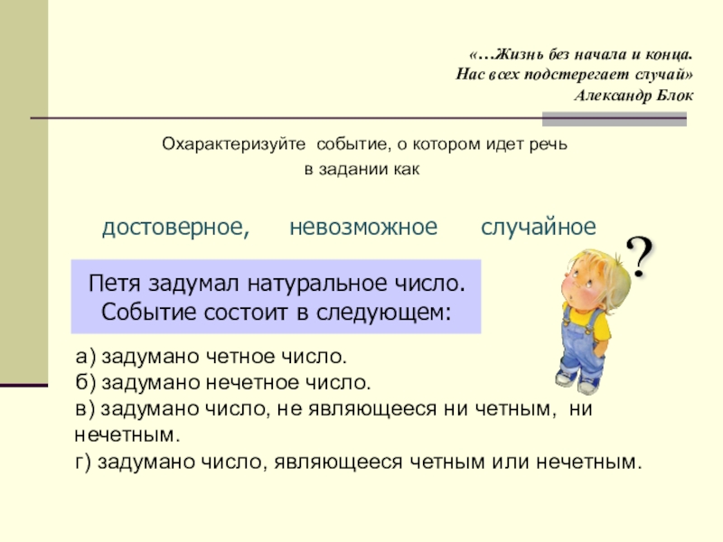 в) задумано число, не являющееся ни четным, ни нечетным.