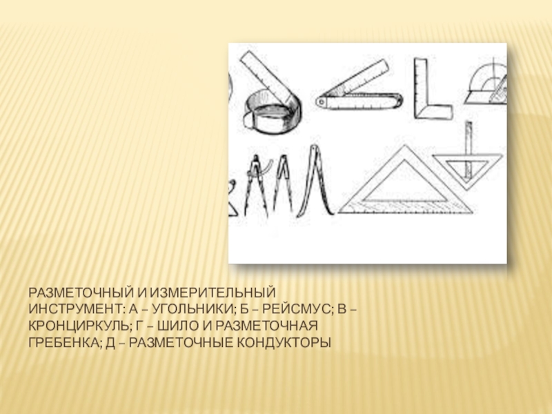 Слайд 5Разметочный и измерительный инструмент: а – угольники; б – рейсмус; в