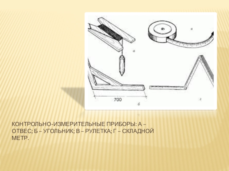 Слайд 4Контрольно-измерительные приборы: а – отвес; б – угольник; в – рулетка;