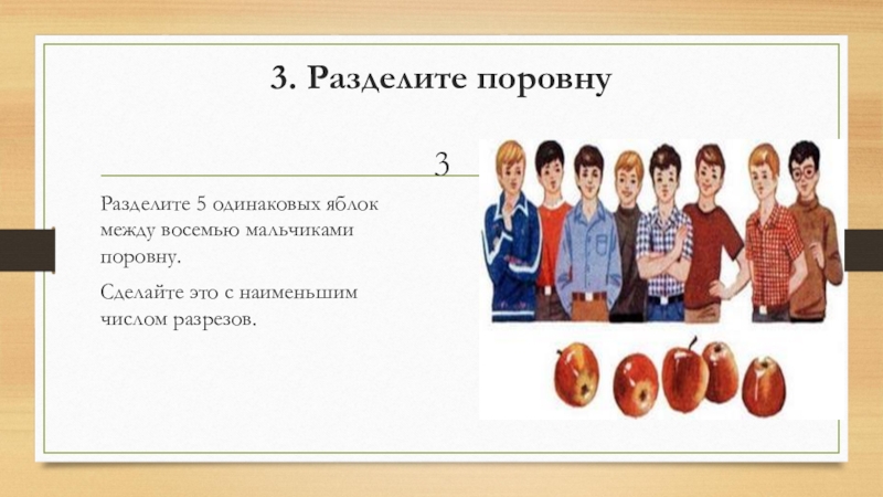 Разделите 5 одинаковых яблок между восемью мальчиками поровну.