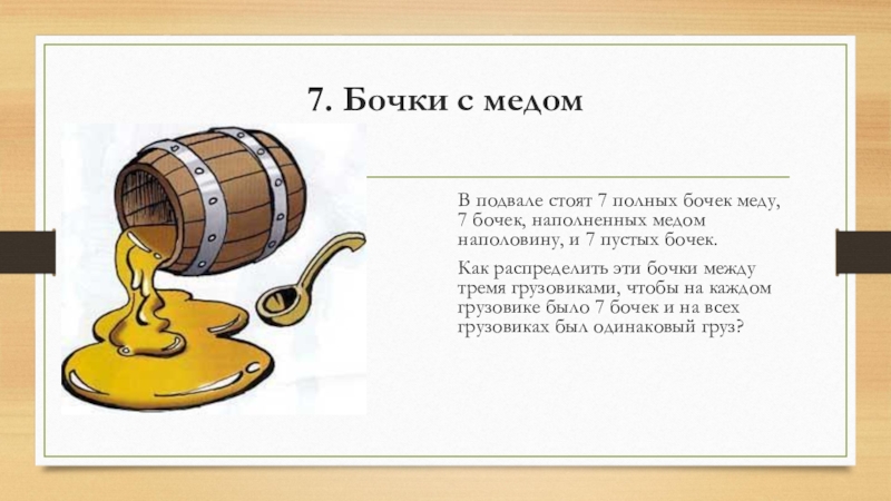 Как распределить эти бочки между тремя грузовиками, чтобы на каждом грузовике было 7 бочек и на всех грузовиках был одинаковый груз?