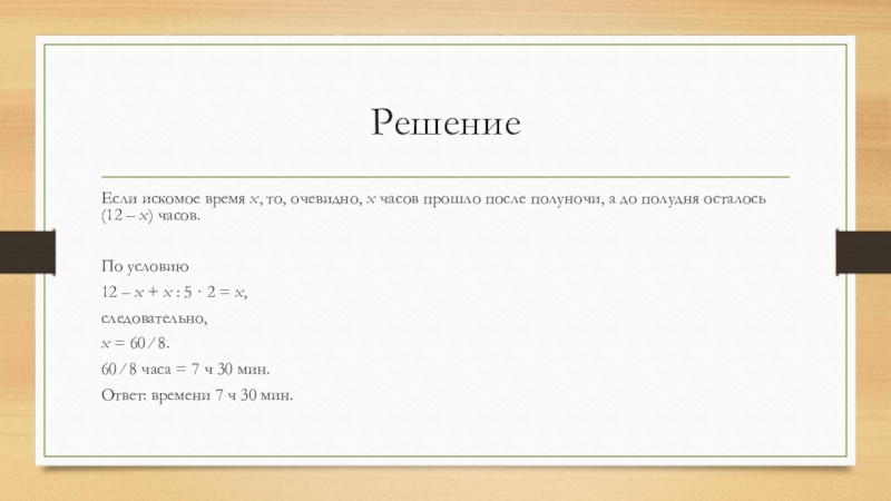 Если искомое время х, то, очевидно, х часов прошло после полуночи, а до полудня