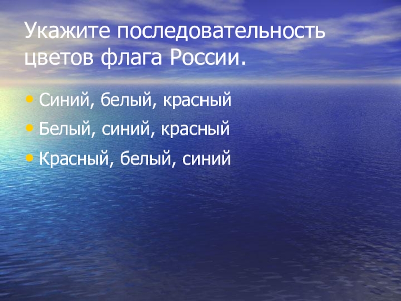 Укажите последовательность цветов флага России.Синий, белый, красныйБелый, синий, красныйКрасный, белый, синий