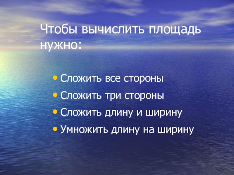 Чтобы вычислить площадь нужно:Сложить все стороныСложить три стороныСложить длину и ширинуУмножить длину на ширину