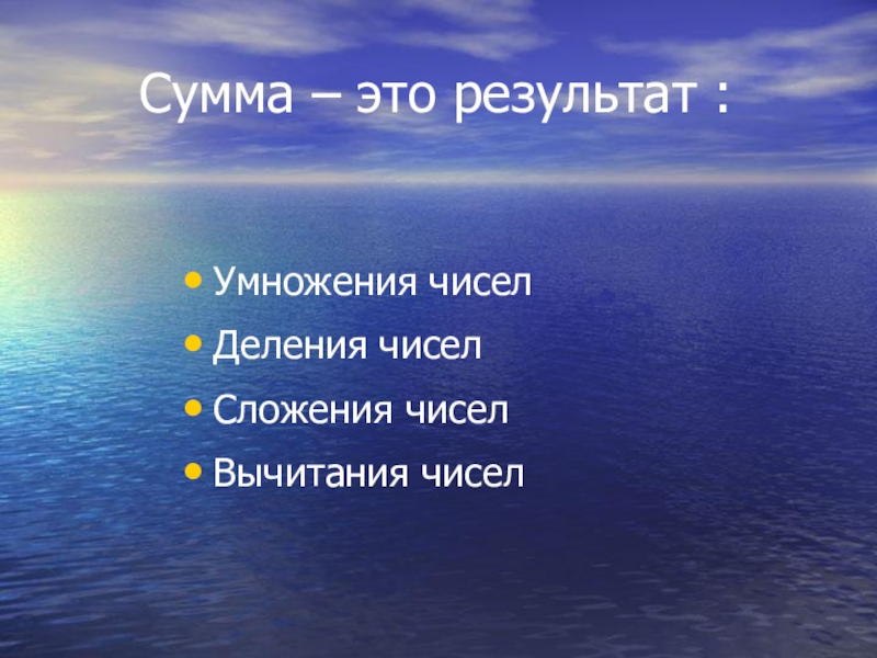 Сумма – это результат :Умножения чиселДеления чиселСложения чиселВычитания чисел