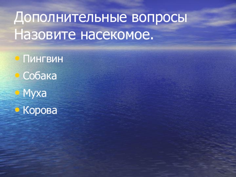 Дополнительные вопросы Назовите насекомое.ПингвинСобакаМухаКорова