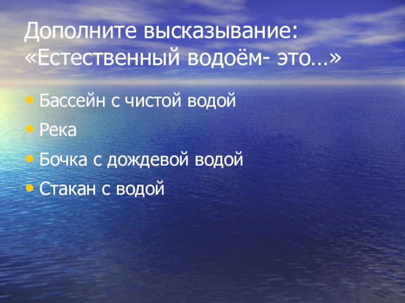 Слайд 19Дополните высказывание: «Естественный водоём- это…»