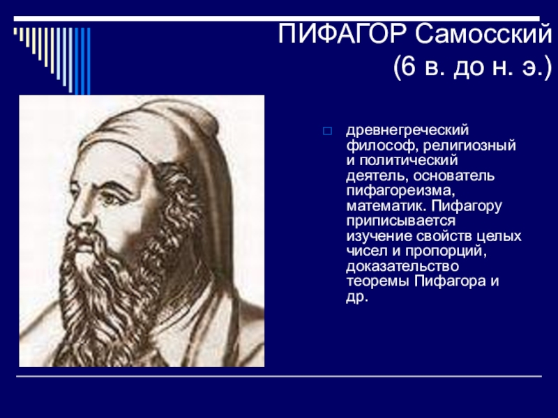 основатель пифагореизма, математик. Пифагору приписывается изучение свойств целых чисел и пропорций, доказательство теоремы Пифагора и др.