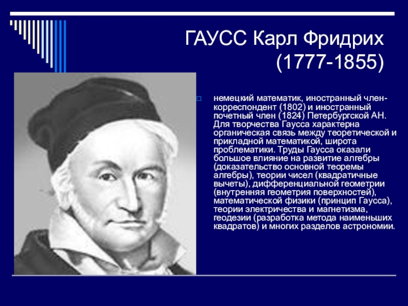 (1824) Петербургской АН. Для творчества Гаусса характерна органическая связь между теоретической и прикладной математикой, широта проблематики. Труды Гаусса оказали большое влияние на развитие алгебры (доказательство основной теоремы алгебры), теории чисел (квадратичные вычеты), дифференциальной геометрии (внутренняя геометрия поверхностей), математической физики (принцип Гаусса), теории электричества и магнетизма, геодезии (разработка метода наименьших квадратов) и многих разделов астрономии.