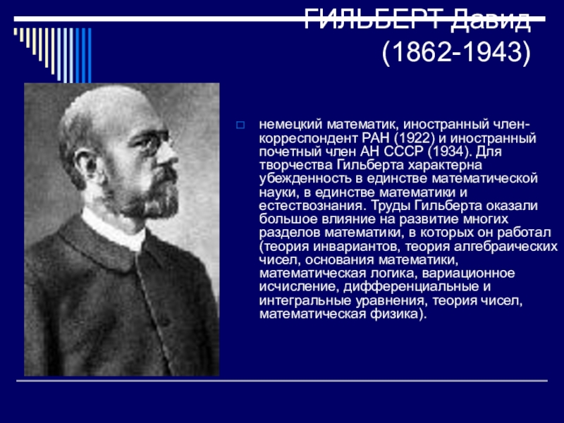 член АН СССР (1934). Для творчества Гильберта характерна убежденность в единстве математической науки, в единстве математики и естествознания. Труды Гильберта оказали большое влияние на развитие многих разделов математики, в которых он работал (теория инвариантов, теория алгебраических чисел, основания математики, математическая логика, вариационное исчисление, дифференциальные и интегральные уравнения, теория чисел, математическая физика).