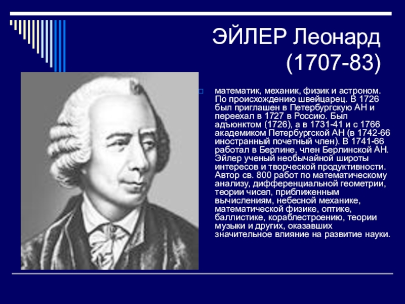 1726 был приглашен в Петербургскую АН и переехал в 1727 в Россию. Был адъюнктом (1726), а в 1731-41 и с 1766 академиком Петербургской АН (в 1742-66 иностранный почетный член). В 1741-66 работал в Берлине, член Берлинской АН. Эйлер ученый необычайной широты интересов и творческой продуктивности. Автор св. 800 работ по математическому анализу, дифференциальной геометрии, теории чисел, приближенным вычислениям, небесной механике, математической физике, оптике, баллистике, кораблестроению, теории музыки и других, оказавших значительное влияние на развитие науки.