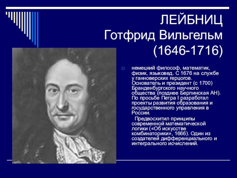 Предвосхитил принципы современной математической логики («Об искусстве комбинаторики», 1666). Один из создателей дифференциального и интегрального исчислений.