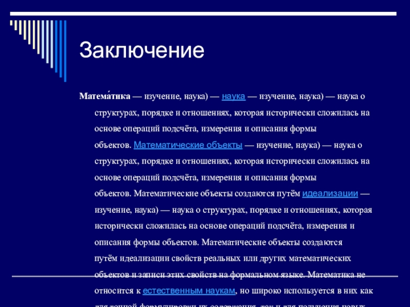 Матема́тика — изучение, наука) — наука — изучение, наука) — наука о структурах, порядке и отношениях, которая исторически