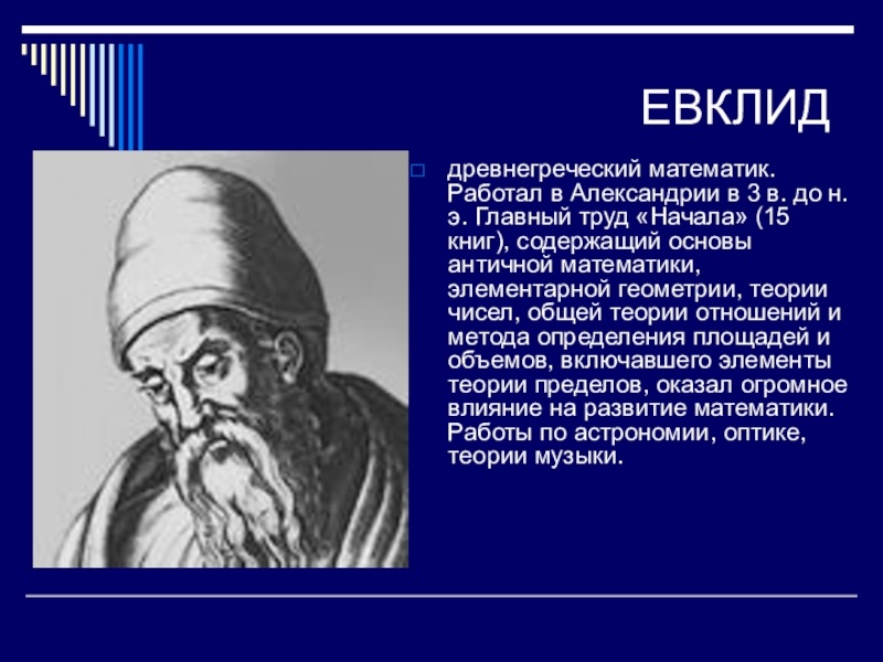 Главный труд «Начала» (15 книг), содержащий основы античной математики, элементарной геометрии, теории чисел, общей теории отношений и метода определения площадей и объемов, включавшего элементы теории пределов, оказал огромное влияние на развитие математики. Работы по астрономии, оптике, теории музыки.