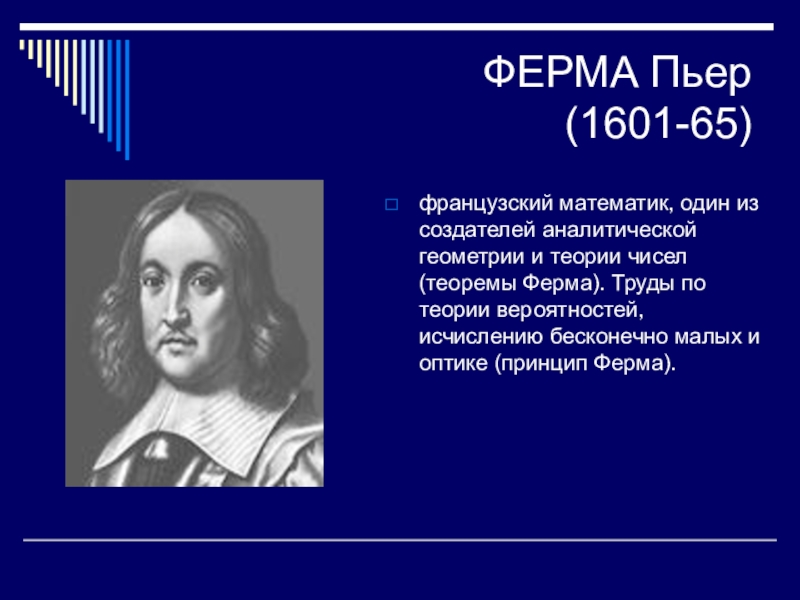 чисел (теоремы Ферма). Труды по теории вероятностей, исчислению бесконечно малых и оптике (принцип Ферма).