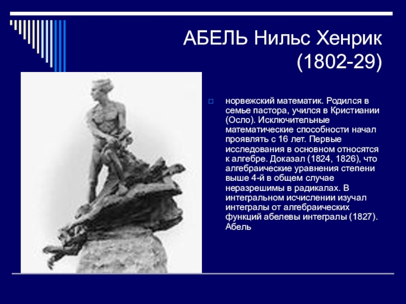 (Осло). Исключительные математические способности начал проявлять с 16 лет. Первые исследования в основном относятся к алгебре. Доказал (1824, 1826), что алгебраические уравнения степени выше 4-й в общем случае неразрешимы в радикалах. В интегральном исчислении изучал интегралы от алгебраических функций абелевы интегралы (1827). Абель