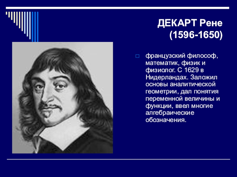 Нидерландах. Заложил основы аналитической геометрии, дал понятия переменной величины и функции, ввел многие алгебраические обозначения.