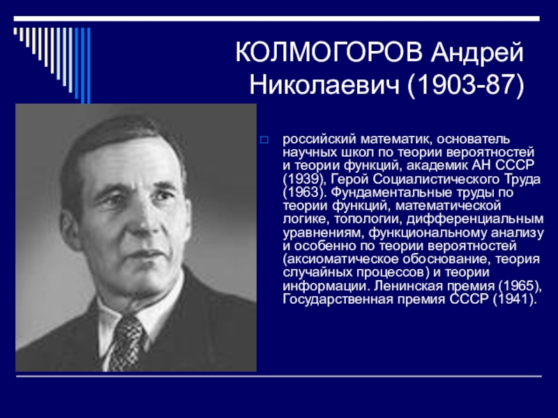 и теории функций, академик АН СССР (1939), Герой Социалистического Труда (1963). Фундаментальные труды по теории функций, математической логике, топологии, дифференциальным уравнениям, функциональному анализу и особенно по теории вероятностей (аксиоматическое обоснование, теория случайных процессов) и теории информации. Ленинская премия (1965), Государственная премия СССР (1941).