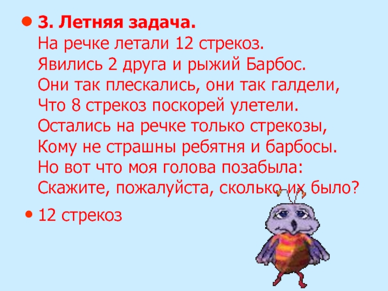 На речке летали 12 стрекоз.