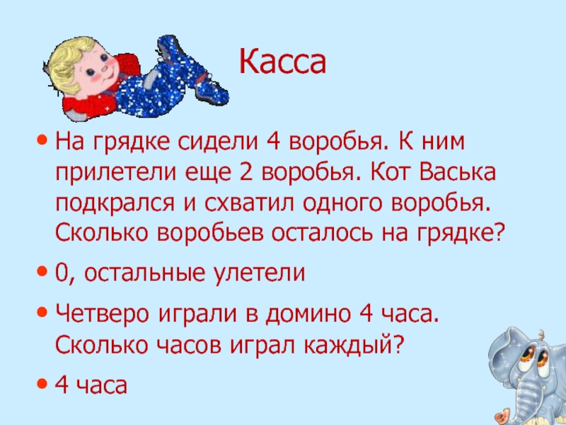 Кот Васька подкрался и схватил одного воробья. Сколько воробьев осталось на грядке?