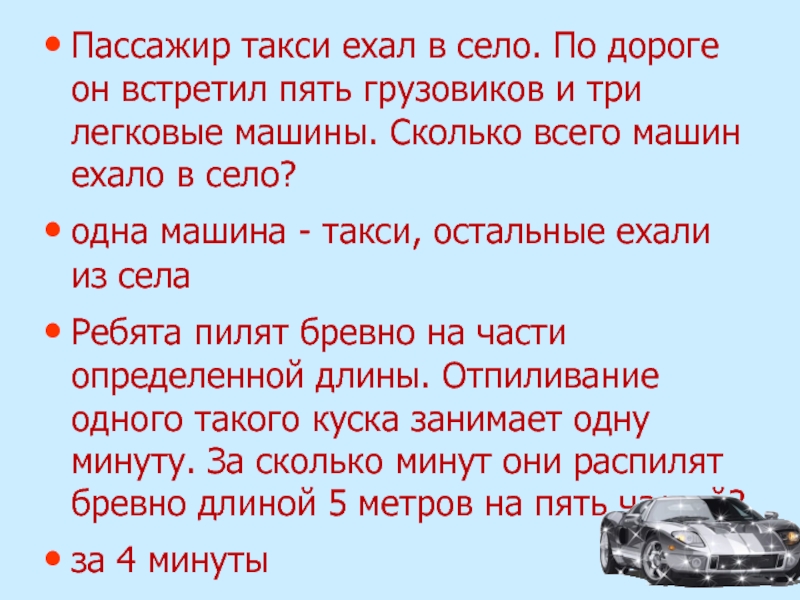 Слайд 7Пассажир такси ехал в село. По дороге он встретил пять грузовиков