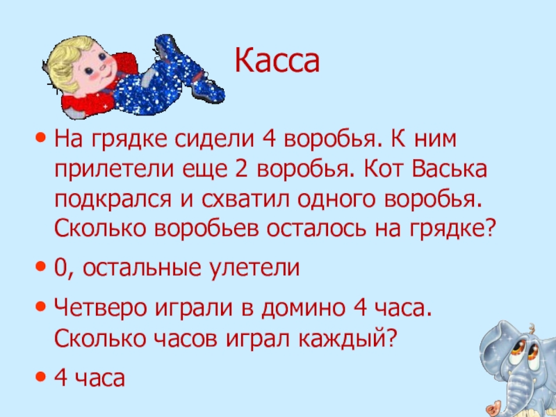 Кот Васька подкрался и схватил одного воробья. Сколько воробьев осталось на грядке?
