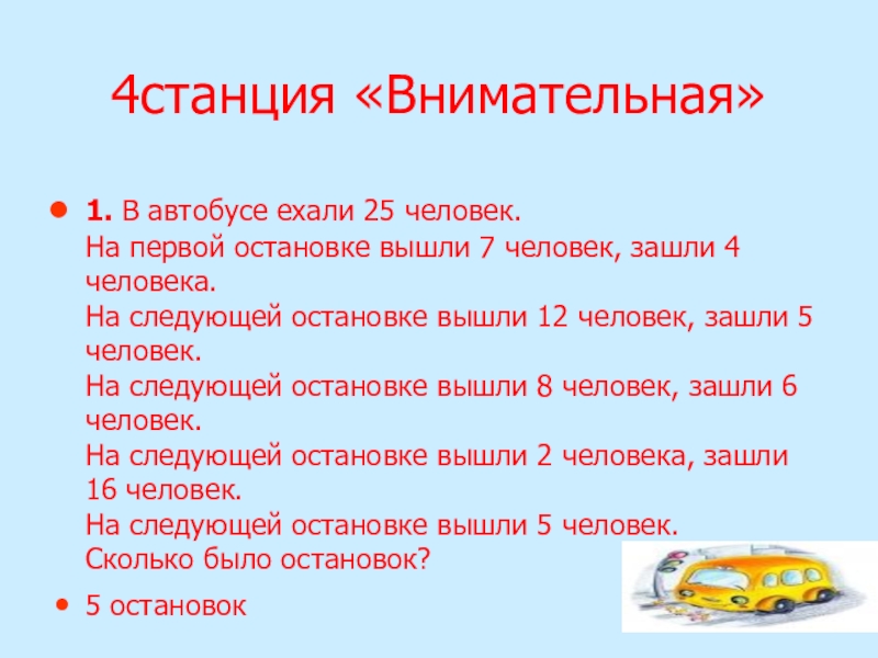 1. В автобусе ехали 25 человек.