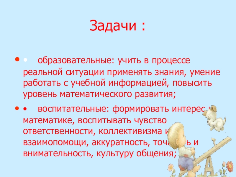 • воспитательные: формировать интерес к математике, воспитывать чувство ответственности, коллективизма и взаимопомощи, аккуратность, точность и внимательность, культуру общения;