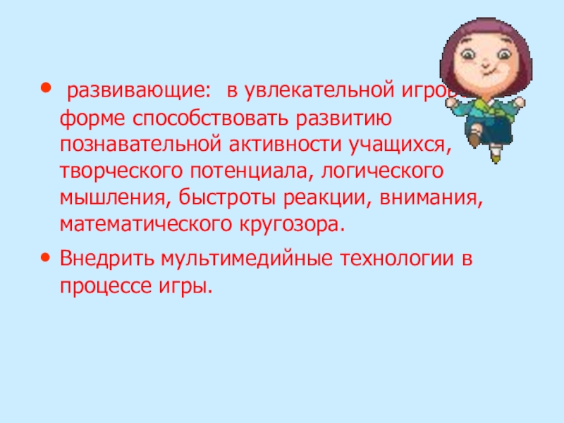 Слайд 4 развивающие: в увлекательной игровой форме способствовать развитию познавательной активности учащихся, творческого