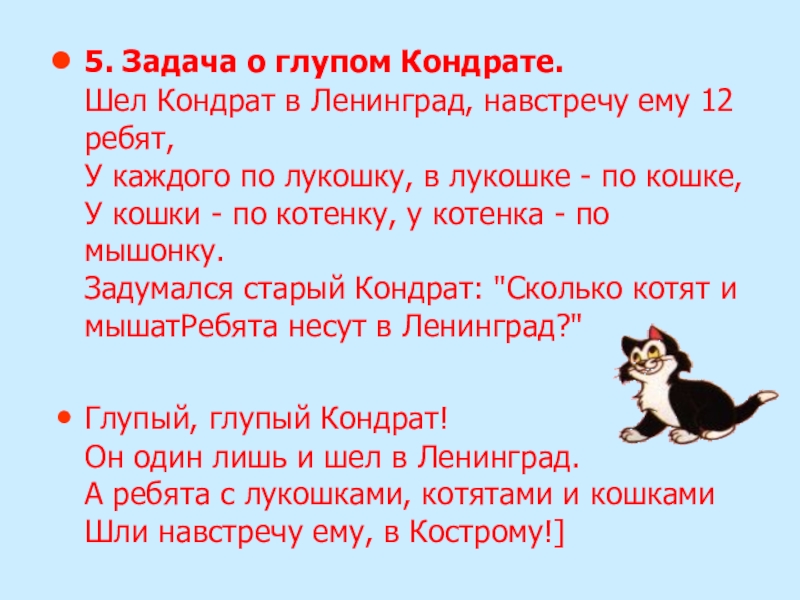 Задумался старый Кондрат: "Сколько котят и мышатРебята несут в Ленинград?"