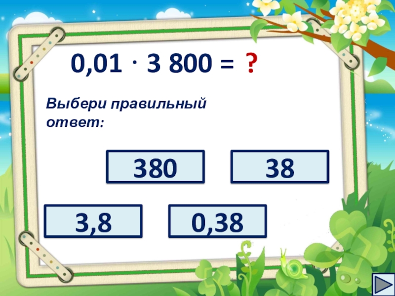 0,01 · 3 800 =?Выбери правильный ответ:3,8380380,38