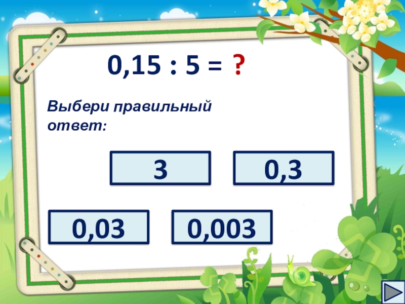 Слайд 120,15 : 5 =