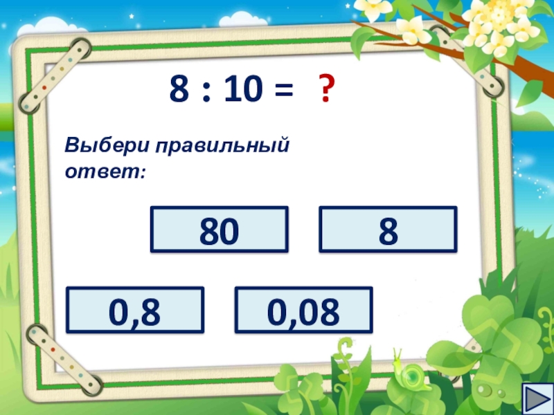 8 : 10 =?Выбери правильный ответ:8800,80,08