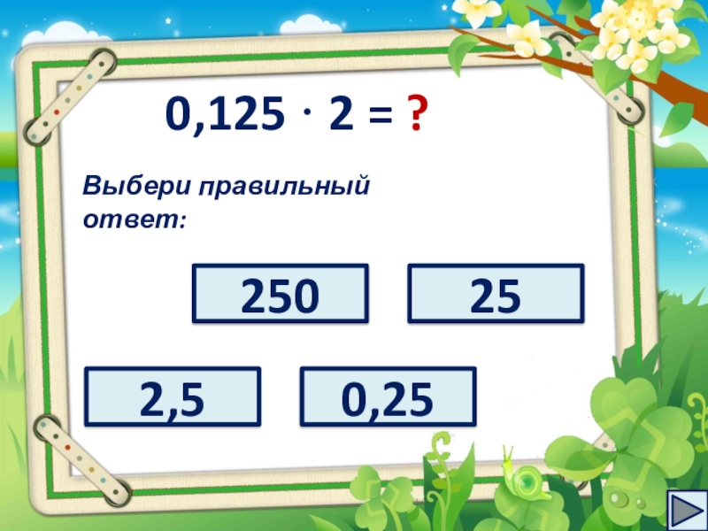 0,125 · 2 =?Выбери правильный ответ:2,52500,2525