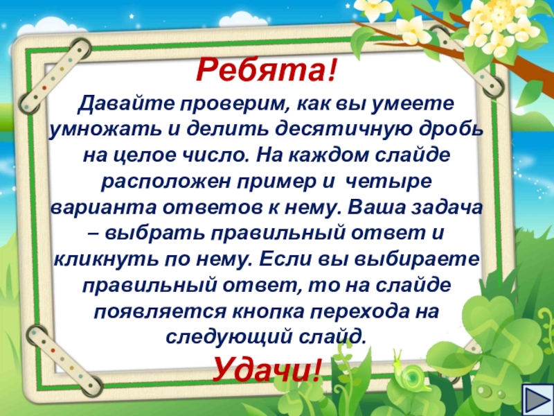 Ребята!Давайте проверим, как вы умеете умножать и делить десятичную дробь на целое число. На каждом слайде расположен пример и четыре варианта ответов к нему. Ваша задача – выбрать правильный ответ и кликнуть по нему. Если вы