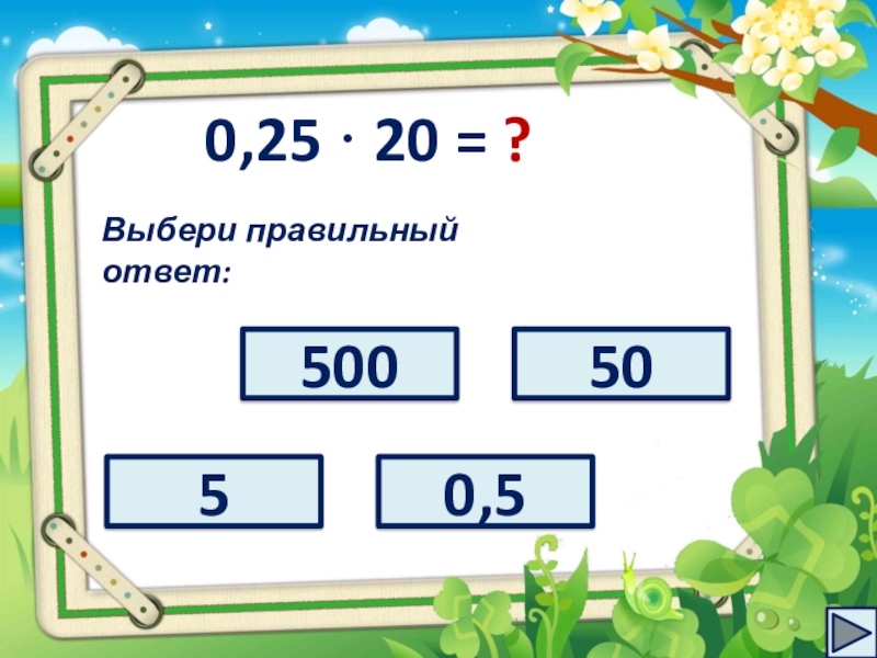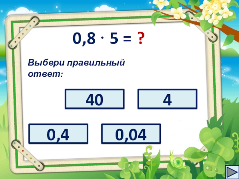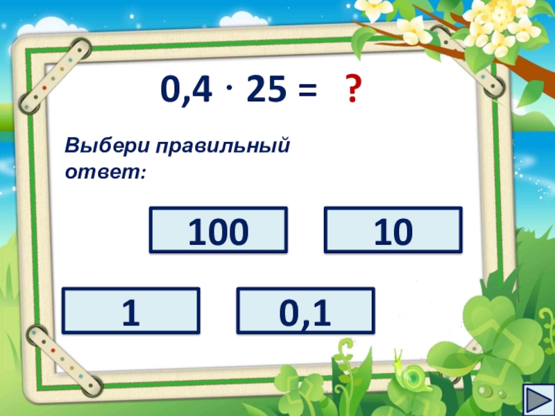 целое число. На каждом слайде расположен пример и четыре варианта ответов к нему. Ваша задача – выбрать правильный ответ и кликнуть по нему. Если вы выбираете правильный ответ, то на слайде появляется кнопка перехода на следующий слайд.