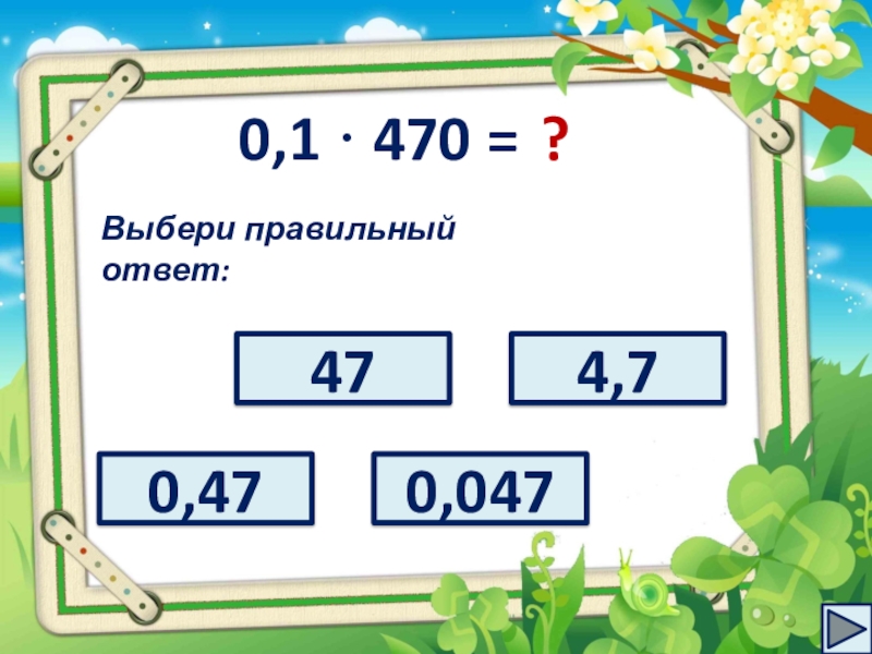 0,1 · 470 =?Выбери правильный ответ:0,474,7470,047