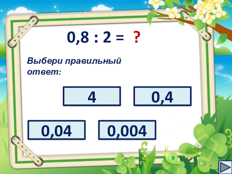 0,8 : 2 =?Выбери правильный ответ:0,0440,40,004