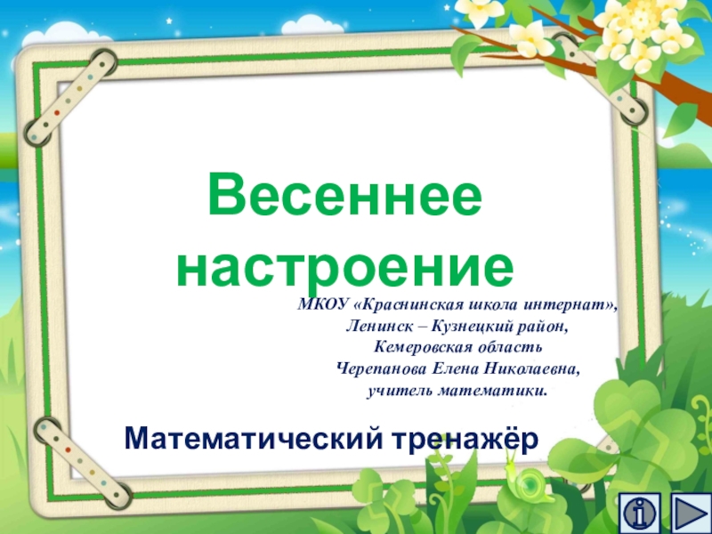 Весеннее настроениеМатематический тренажёрМКОУ «Краснинская школа интернат»,Ленинск – Кузнецкий район,Кемеровская областьЧерепанова Елена Николаевна,учитель математики.