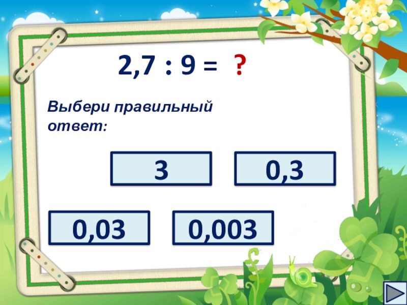 2,7 : 9 =?Выбери правильный ответ:0,0330,30,003