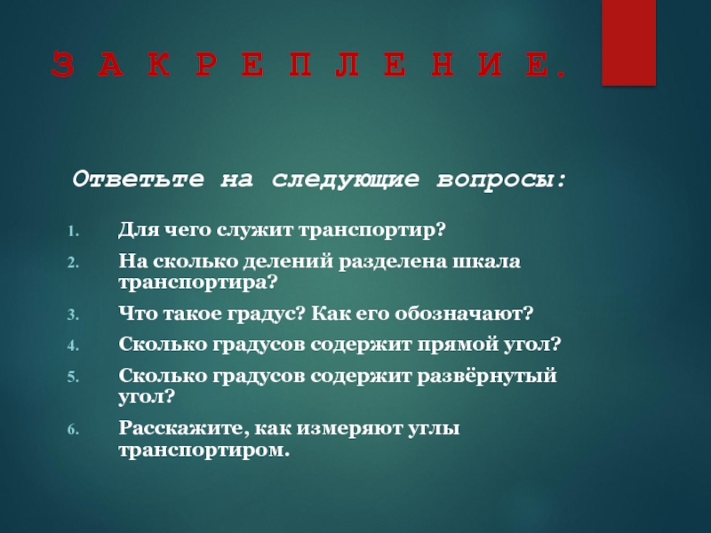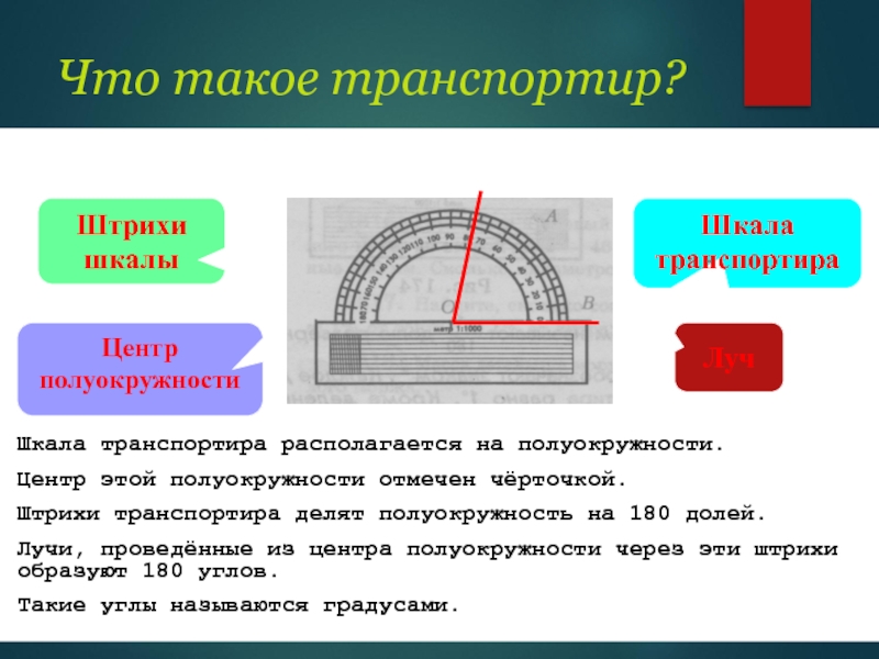 3.ВТОРАЯ СТОРОНА УГЛА ПЕРЕСЕКЛА ШКАЛУ ТРАНСПОРТИРА;