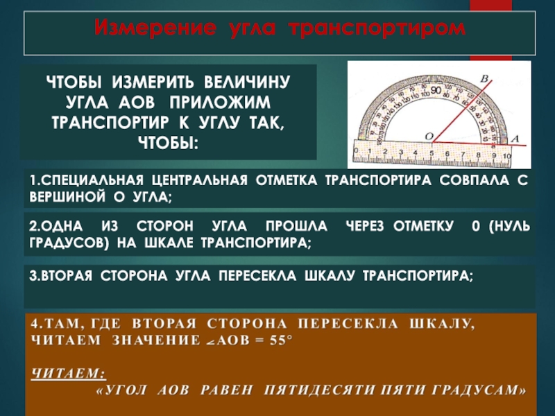2.ОДНА ИЗ СТОРОН УГЛА ПРОШЛА ЧЕРЕЗ ОТМЕТКУ 0 (НУЛЬ ГРАДУСОВ) НА ШКАЛЕ ТРАНСПОРТИРА;