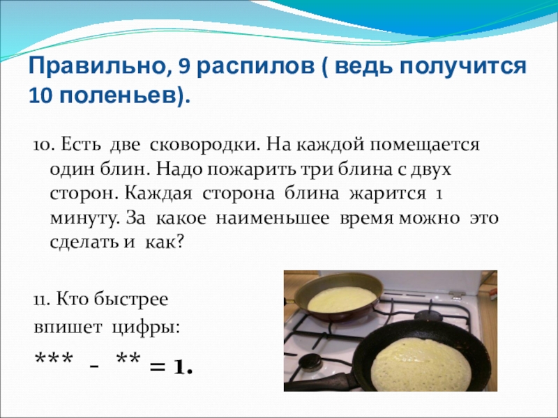 Слайд 7Правильно, 9 распилов ( ведь получится 10 поленьев).