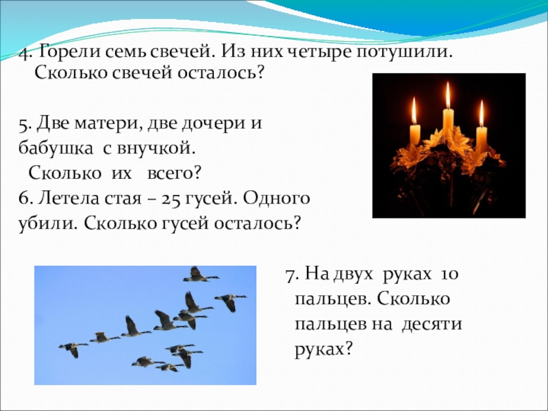 4. Горели семь свечей. Из них четыре потушили. Сколько свечей осталось?